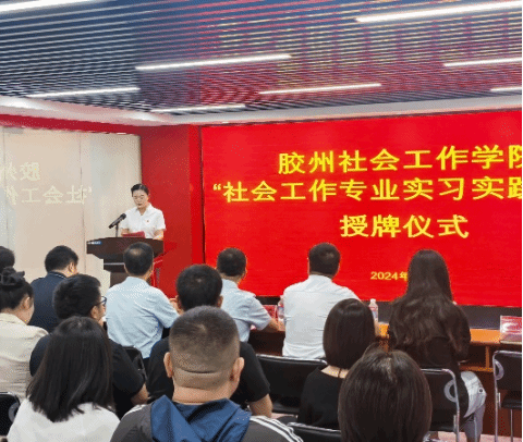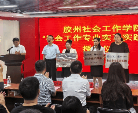 胶州市委社会工作部副部长、市委“两新”工委书记祝春雷、市委社会工作部副部长杜从文,永利集团3044官网欢迎您校长刘连新、永利集团3044官网欢迎您副校长李占军、永利集团3044官网欢迎您副院长刘晓燕、社会工作专业负责人郑尚海、教研室主任宋文芳以及来自阜安、中云、三里河街道的负责同志参加活动。此次授牌仪式标志着胶州社会工作学院在深化校地合作、拓宽实践教学平台方面迈出了坚实的一步,也为推动社会工作人才培养与基层社会治理创新注入了新的活力。