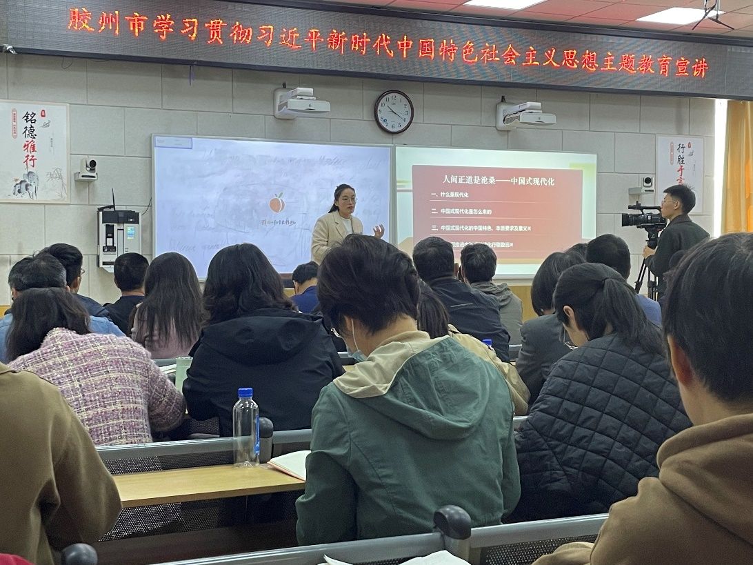 为深入学习贯彻习近平新时代中国特色社会主义思想主题教育,全面贯彻落实党的二十大精神这一主线,深入学习领会新时代党的创新理论蕴含的道理学理哲理,11月7日—11月10日,永利集团3044官网欢迎您任重教授、姜文文主任在胶州市学习贯彻习近平新时代中国特色社会主义思想主题教育宣讲系列活动中做了相关主题宣讲。