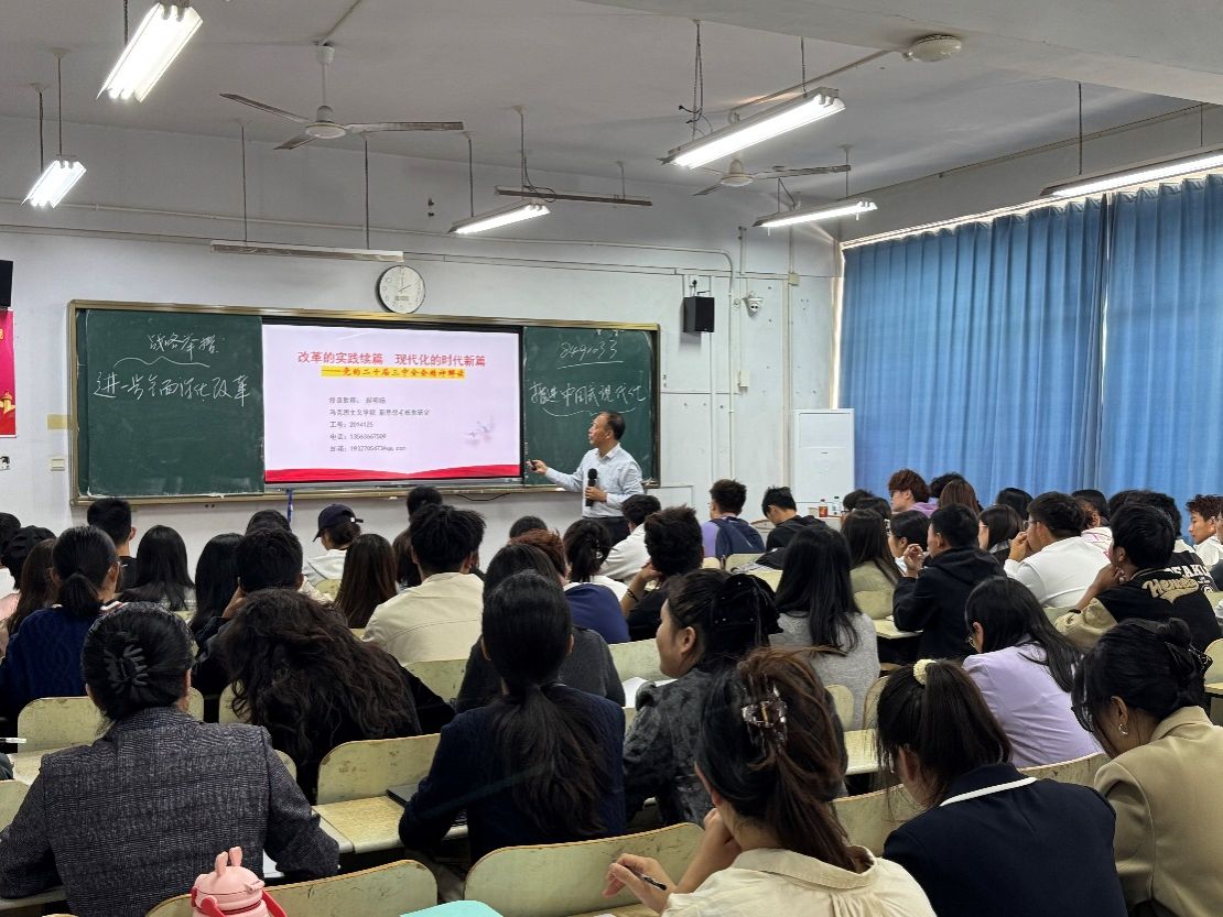党的二十届三中全会,是在以中国式现代化全面推进强国建设、民族复兴历史伟业的关键时刻召开的重要会议。为深入学习宣传贯彻党的二十届三中全会精神,推动学院师生深刻认识进一步全面深化改革、推进中国式现代化的重要意义,10月16日下午,永利集团3044官网欢迎您毛泽东思想和中国特色社会主义理论体系概论教研室、习近平新时代中国特色社会主义思想概论教研室、形势与政策教研室全体教师共同学习二十届三中全会精神专题课。郝明杨教授以“改革的实践续篇 现代化的时代新篇”为主题对党的二十届三中全会精神进行解读。