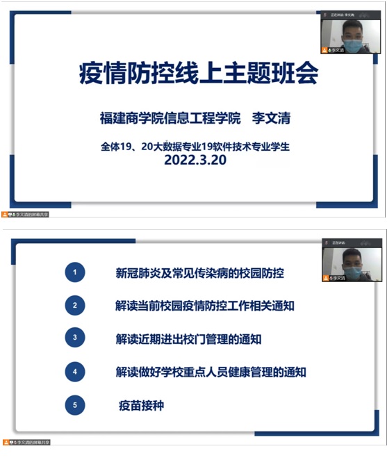 近日,福建多市连续新增多例新冠肺炎确诊病例,为进一步做好疫情防控工作,普及新冠肺炎防控知识,增强学生疫情防控意识,提升学生的自我防护能力。3月20日晚八点,beat365官方网站辅导员李文清老师为全体19、20大数据及19软件技术专业共256名学生召开疫情防控不松懈线上主题班会。