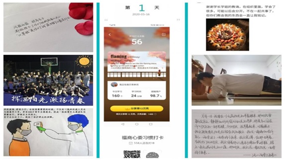 心理健康月系列活动包括“毕业生行动、21天习惯养成计划、致疫情后的自己、心理健康征文大赛、心理健康情景剧剧本大赛”等,呼吁大学生关注心理健康,珍爱自己,关爱他人,奉献社会。本次活动中“毕业生行动、21天习惯养成计划”均借助了打卡小程序,keep应用程序等相关平台。同学们热情洋溢地表达着对学长学姐们的美好祝福。在爱与关怀之外还能养成一个良好的打卡习惯,同学们踊跃参与。向日葵心理健康服务团秉持不骄不躁,为同学服务的赤诚之心,继续开展致疫情后的自己、心理健康征文大赛、心理健康情景剧大赛等。特殊时期,本次系列活动均采取线上方式开展。
