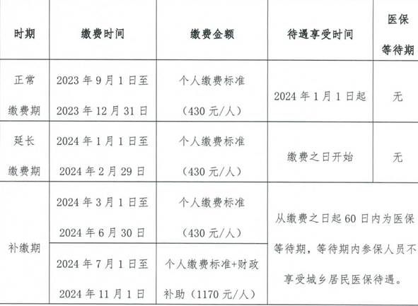 未在规定参保缴费期限(202391日至2024229)办理参保缴费的大学生,允许其参保缴费,但设有60天的等待期,等待期过后再按规定享受相应的医疗保险待遇,缴费之前和等待期期间发生的医疗费用,医保基金不予支付。202431日至630日补缴费人员,个人缴费标准为430;202471日之后补缴费人员,参保人应缴金额为1170元。具体见下表: