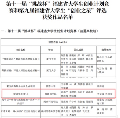 由团省委、省教育厅、省人社厅、省科协、省学联联合举办,阳光学院、共青团福州市委承办的第十一届“挑战杯”福建省大学生创业计划竞赛已落下帷幕,beat365官网参赛项目《健康先生Mr.H》荣获银奖。