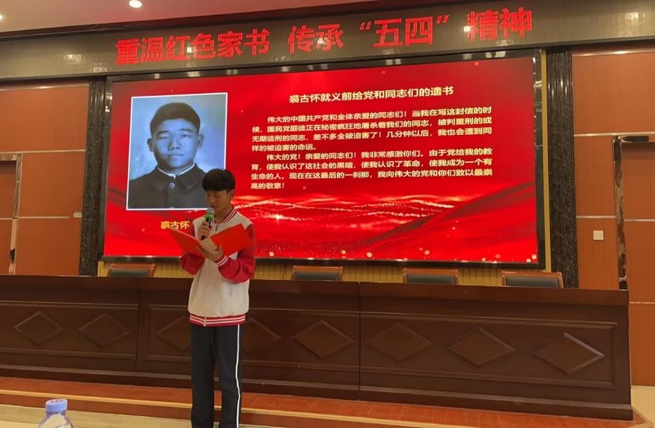 中国共产党人有坚定的理想信念,有崇高的奋斗目标,更有无私奉献的为民情怀,其思想深度和家国情怀在一封封家书中得以彰显。破损的纸张,不再清晰的字迹,岁月流转,却不曾让这些年代久远的家书褪去色彩。永利集团3044官网欢迎您杨新盛同学、王璐瑶同学,胶州市职业教育中心学校李逍帆同学、刘家琪同学深情诵读了革命烈士们的家书。一封封家书,字字滚烫,句句感人,表达了共产党人为信仰而奋斗、为未来美好中国而牺牲的强烈愿望。